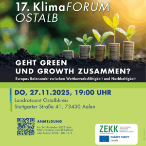 Wir laden Sie herzlich ein, am Donnerstag den 27.11.2025 beim 17. Klimaforum Ostalb dabeizusein! Die Veranstaltung des EUROPoint Ostalb und der ZEKK findet im Landratsamt in Aalen, Stuttgarter Str. 41, 73430 Aalen, im Großen Sitzungssaal statt. Los geht es um 19 Uhr. Thema des Abends ist “Geht Green und Growth zusammen? Europas Balanceakt zwischen Wettbewerbsfähigkeit und Nachhaltigkeit”.