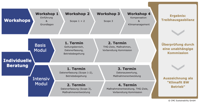 Das Klimafit BW Projekt umfasst eine WorkshopReihe sowie die individuelle Beratung der Unternehmen vor Ort oder Remote.
